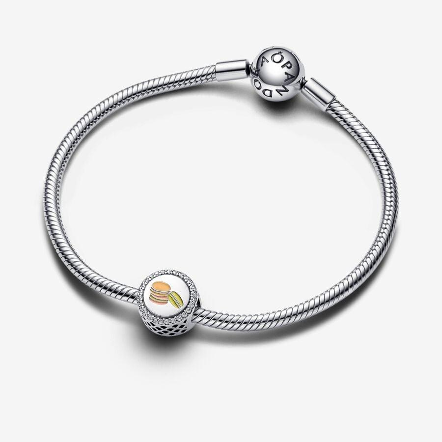 Notre Charm gravable Macaron est un hommage savoureux à l'emblématique confiserie française. Ce charm rond est orné de 54 oxydes de zirconium cubiques clairs taillés en brillant et d'un émail aux couleurs vives, représentant trois délicieux macarons sur une face. Les bords pavés et les losanges ajoutent une touche sophistiquée. Personnalisez la face opposée avec une gravure réalisable en boutique.